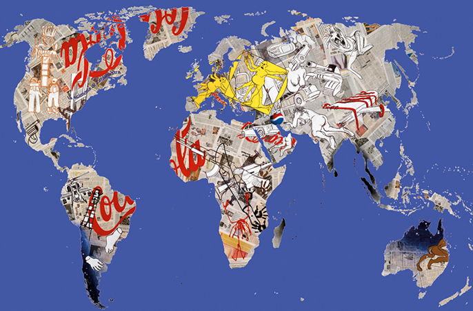 "[...] The Atlas of the globalized world could therefore be read as an anamorphic object, an object born from a perturbing break with the familiar, to make us see something else. And so another path, another story is created, telling us about what is unspeakable, unimaginable, decreeing the end of the tension between Earth and World, protected by caring gestures, declaring that the World has suffocated Earth, that any entity may exist solely by virtue of its functionality, as a means for consumption. With its excessive repetition of details, distributed on a disfigured surface, it cuts a rift in the compact, logical and reassuring tale of the path of civilization, victoriously followed by the West.